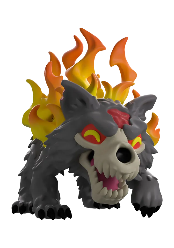 Wait, what round is it? Oh no, they’re coming! Get ready for the Hellhounds!! Stalking forward at 3.6-inches tall with bright orange and yellow flames rising from their back, the shaggy grey fur that covers their body has been stripped from their face to leave a snarling skeletal muzzle and glowing red eyes as chunks of their skin has fallen off revealing raw flesh and bone. The exterior of their packaging sees the Hellhound prowling through the ruined alleys of a ruined town, while the interior is pitch black and covered in a vibrant red blood spray. The protective sleeve sees a beaten-up wood panelling with red notches marked in it as their figure can be seen through the large clear window at the packaging’s front.