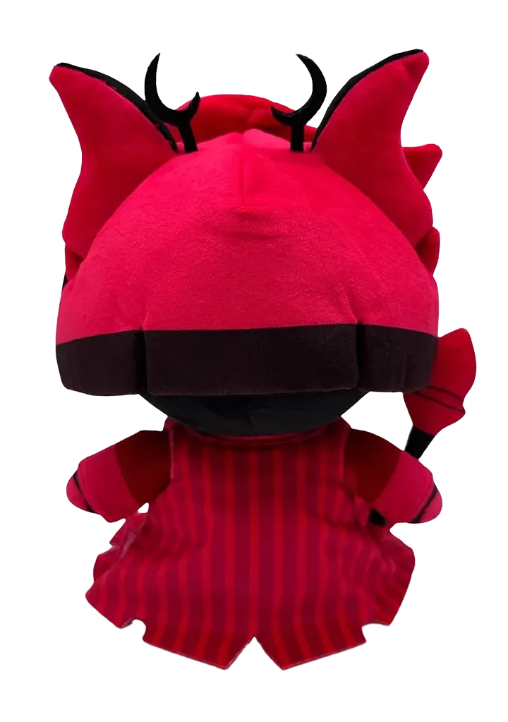 Sitting at 9 inches tall with a sharp smile stretching across his face underneath menacing red eyes, his vibrant pink hair sweeps to the side and falls down either side of his head with black tips as a pair of pointed ears stick out from the top. With a monocle to the side of his right eye and holding a long cane with a microphone on the end, he’s dressed in a pinstripe red coat with white trim around the lapel as his hoofed feet kick forward.