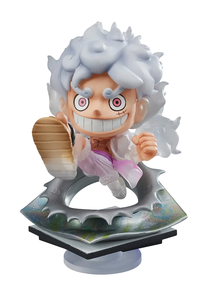 This highly detailed 4-inch tall One Piece figure has such a unique stylization you will not find anywhere else! The statue design is based on the illustration on the long running popular sticker series, Niformation in Japan. It looks as if your favorite anime character is popping up from the original sticker illustration. Featuring dynamic sculpting, clear parts, and detailed paint this is not to be missed! The One Piece Monkey D. Luffy Gear 5 Niformation Tsukuru Statue stands approximately 4-inches tall and comes with a stand.