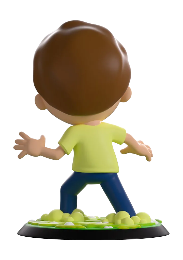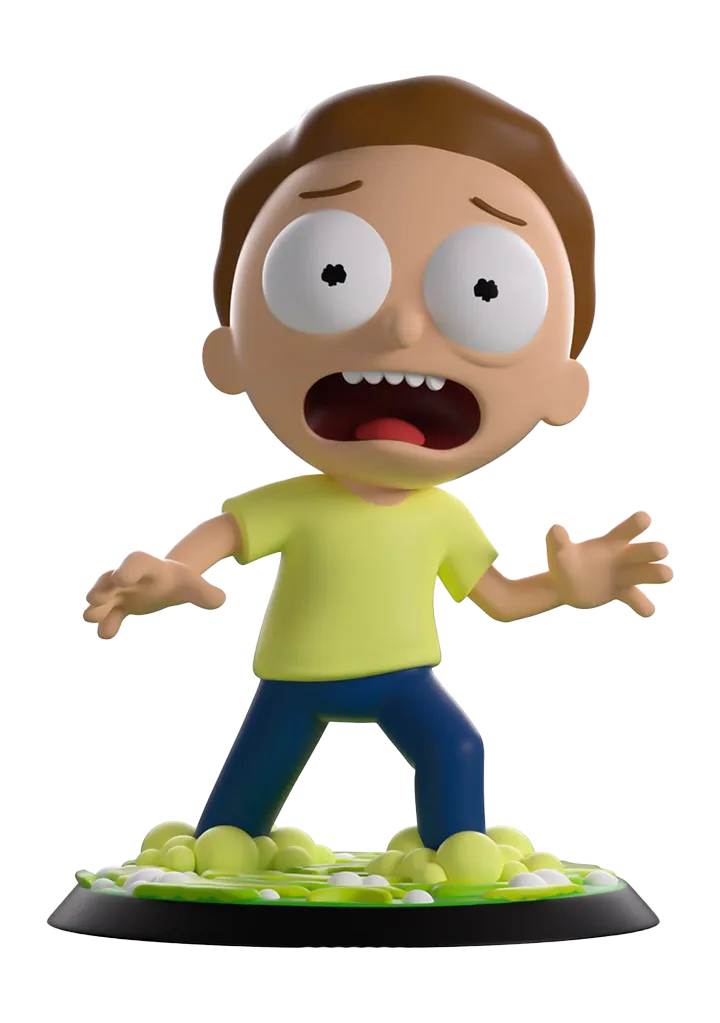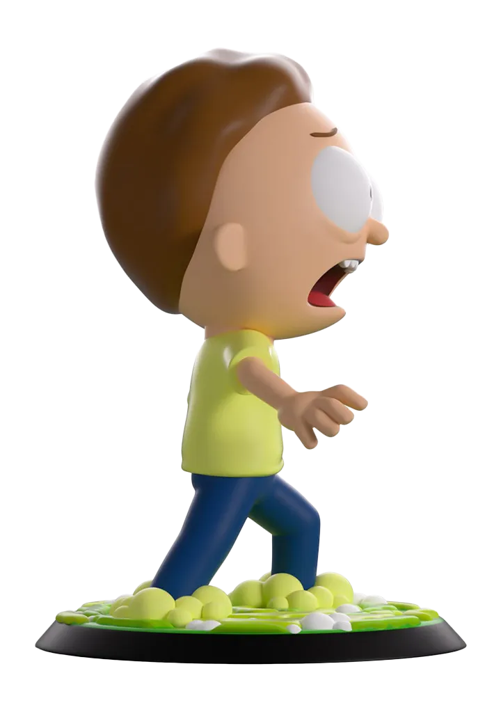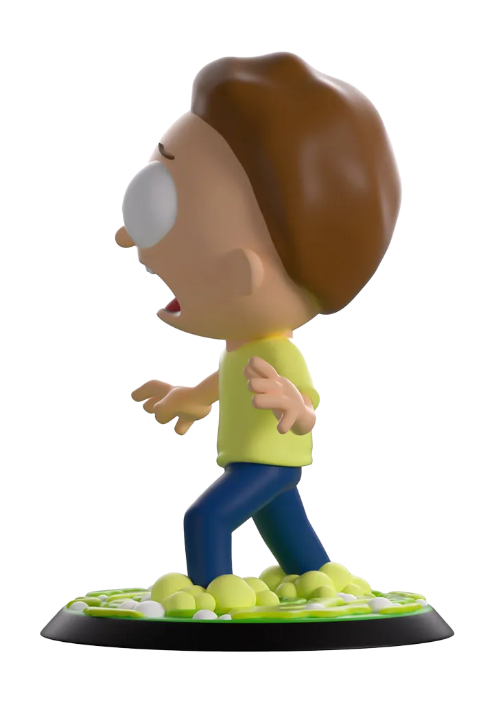 Morty got kicked into a portal to end up in the wildest dimension of all, Youtooz! Standing at over 3 1/2-inches tall and flinging out his hands as he takes a panicked step back getting ready to bolt to safety, sheer terror marks his face as a fearful shriek blasts out from his open mouth that sits under bulging eyes. With short brown hair covering his head and a swirling green portal that bubbles around his feet, he wears a pale yellow shirt and blue pants. The exterior of his packaging sees Morty venturing into a new dimension with floating pyramids in the background. The interior is then covered in green line drawings over a black background which continues onto the protective sleeve where his figure can be seen through the large clear window at the packaging’s front.