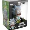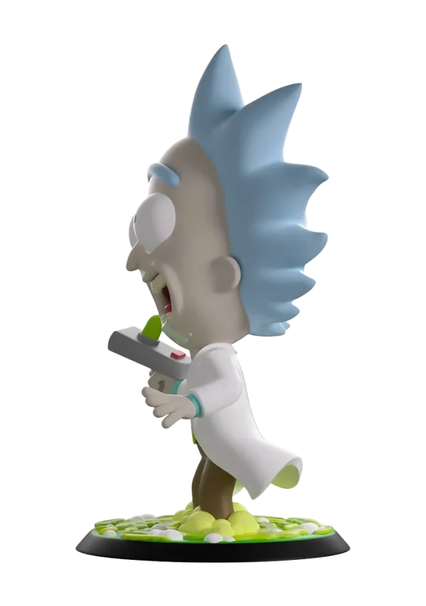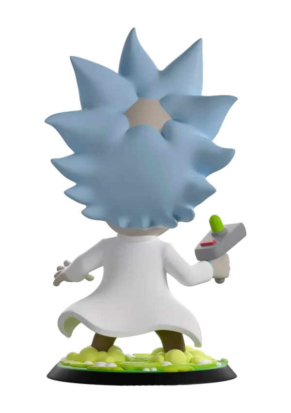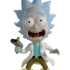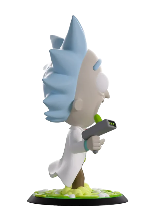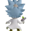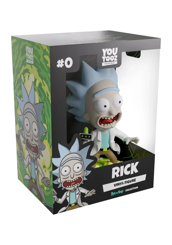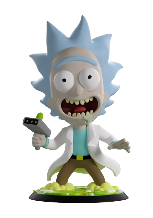 Rick portalled straight into Youtooz to cause some havoc with his debut! Standing at 5-inches tall and brandishing his trusty portal gun in a raised hand as drool seeps out from the manic open smile plastered on his face, a pair of huge round eyes bulge out from underneath a blue unibrow as spiked hair flies wildly to the sides of his balding head. Knee deep in the swirling green portal that bubbles around his feet, a white lab coat flows from his shoulders as he wears a pale blue shirt tucked into brown pants. The exterior of his packaging sees Rick and Morty flying through space. The interior is then covered in green line drawings over a black background which continue onto the protective sleeve where his figure can be seen through the large clear window at the packaging’s front.