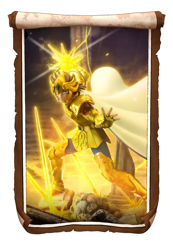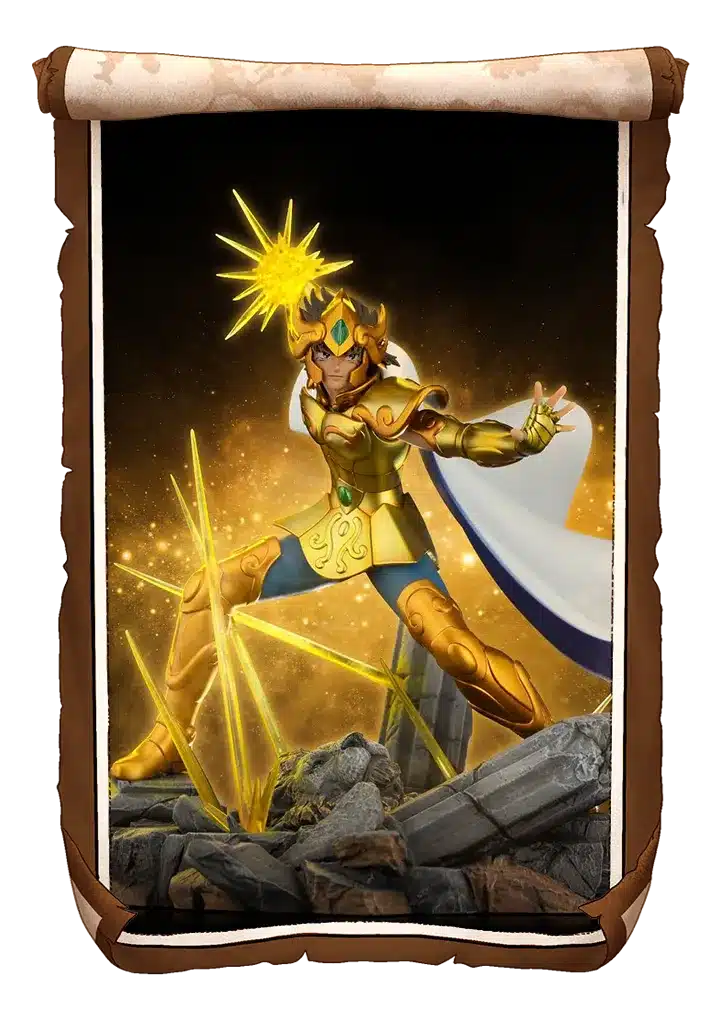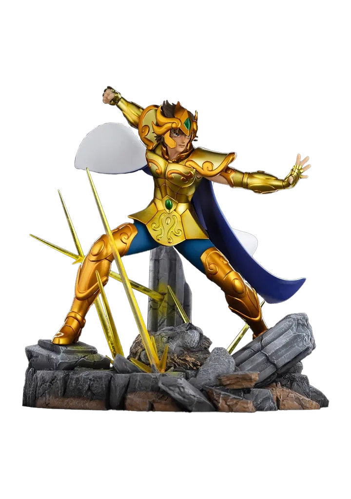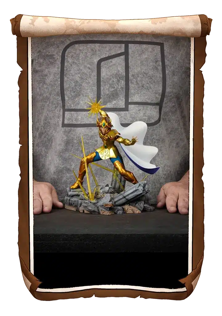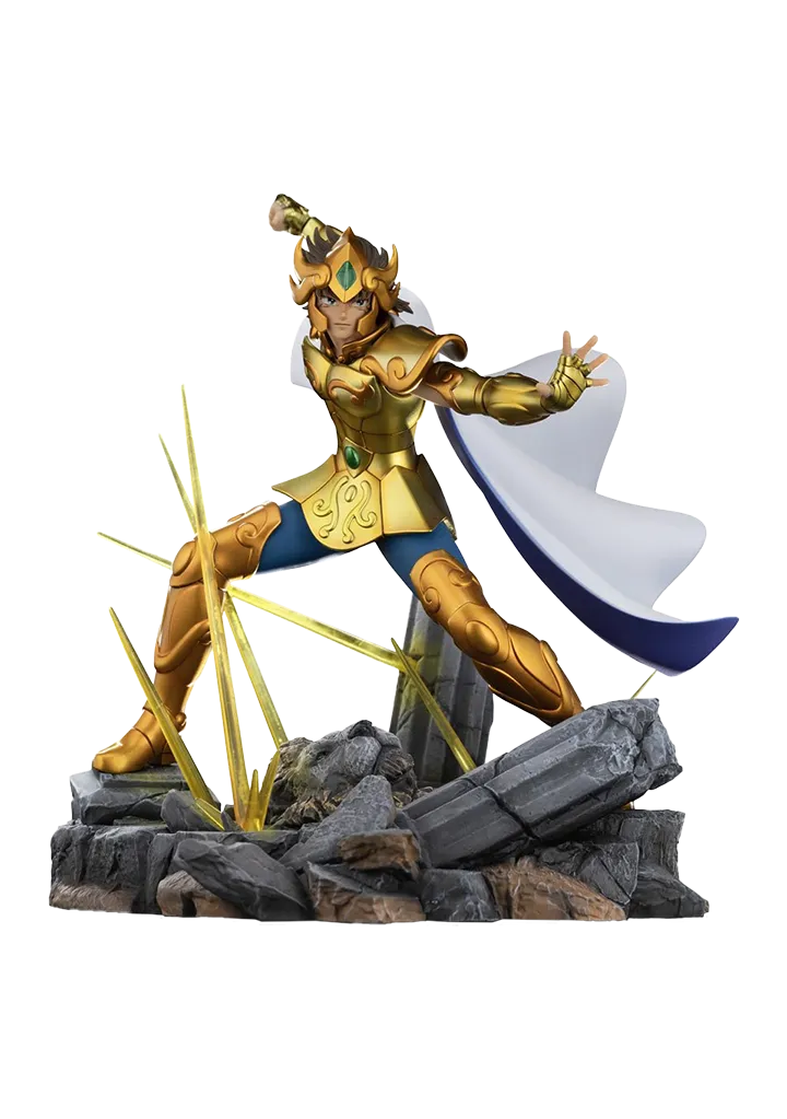 With his Cosmo concentrated in his fist, unleashing 100 million punches at the speed of light, Aiolia is depicted performing one of his most famous attacks, the Lightning Plasma, with an energy focus in his right hand and projectiles of the attack scattered around the base – a golden explosion worthy of a Gold Saint. The details of his armor are precisely portrayed, just as in the classic anime, featuring a green gem on his navel and another on his forehead. Unlike in the manga, his hair is light brown, and a flowing white and blue cape adds a sense of movement to his attack in the second Gold Saint revealed in the Saint Seiya collectible line.