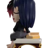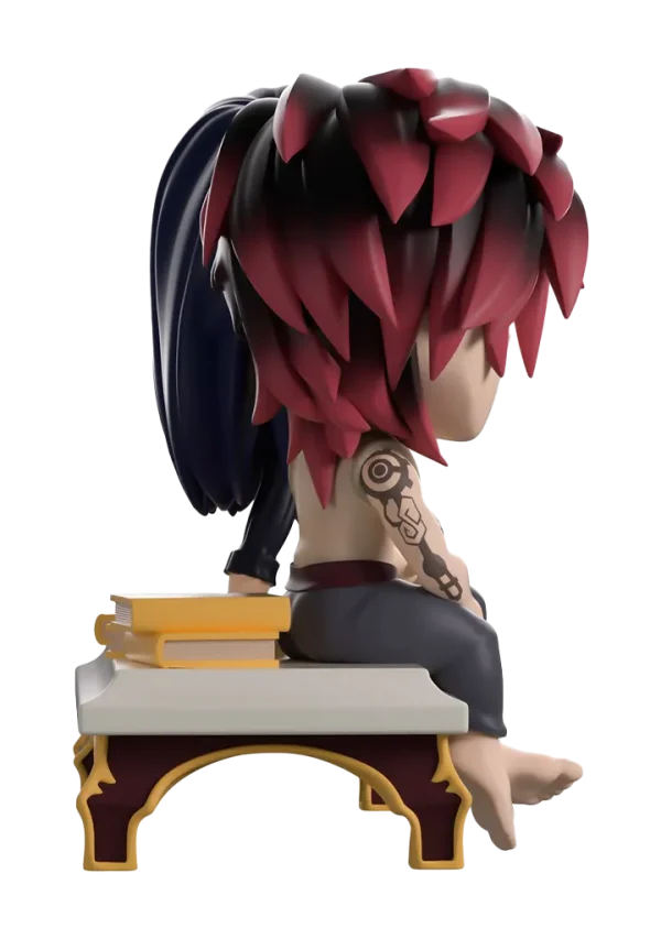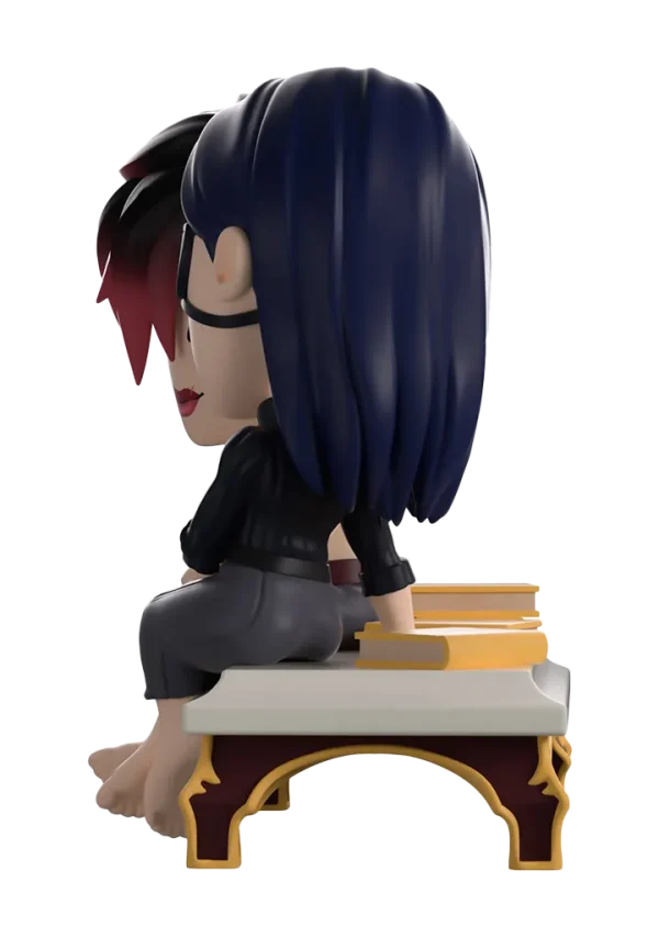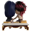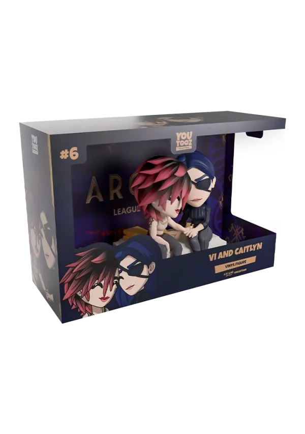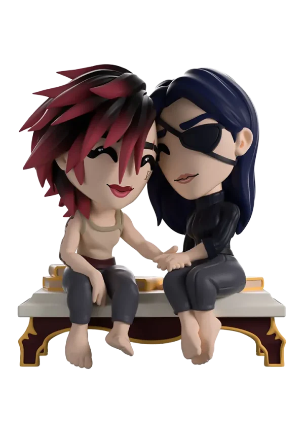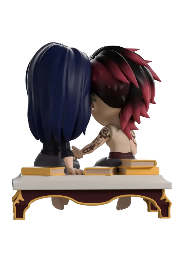 Vi and Caitlyn have taken a step away from the drama happening in Piltover to share a tender moment with their return to Youtooz. At just under 4 1/2-inches tall, this scene sees Vi and Caitlyn sitting on a white bench with books behind them as Vi extends her arm to hold onto Caitlyn’s hand and their heads press gently together. Both with relaxed smiles as they just enjoy each other’s company, Vi’s shaggy red black hair sweeps to the side as she wears a beige singlet and grey pants, while an eyepatch covers Caitlyn’s left eye and her long blue hair is tucked behind her ear as she wears a ribbed black turtleneck. The exterior of their dark blue packaging is covered in deep red and gold streaks running down it and a pink symbol at its center. These then work their way onto the smudged red and blue interior, while the protective sleeve is a dark blue with a simple golden frame as their figures can be seen through the large clear window at the packaging’s front.