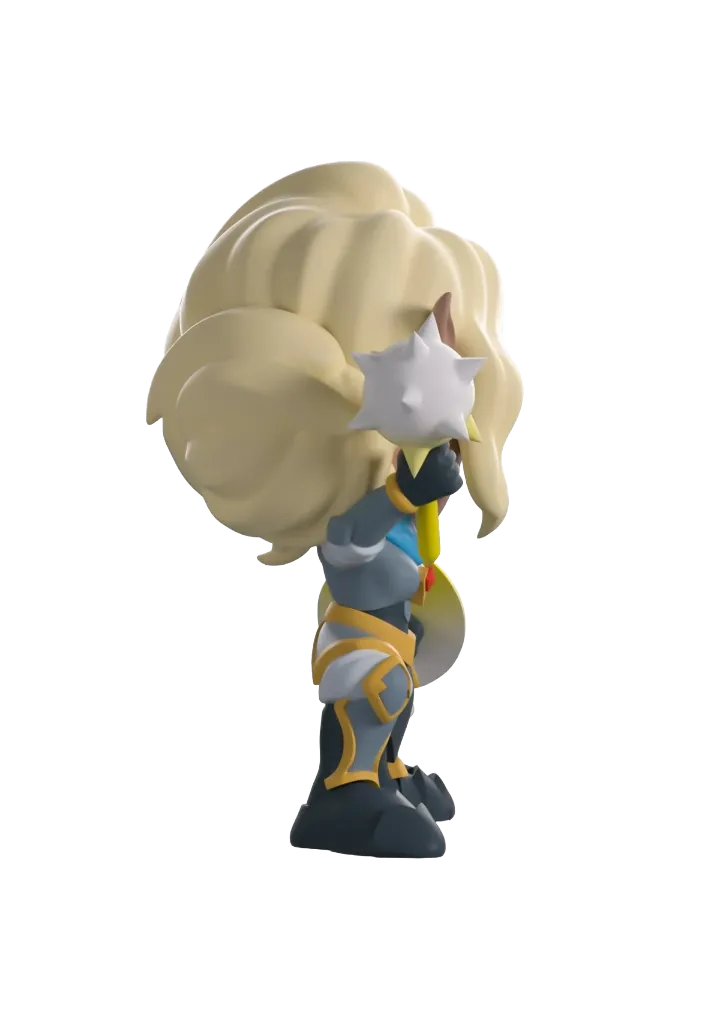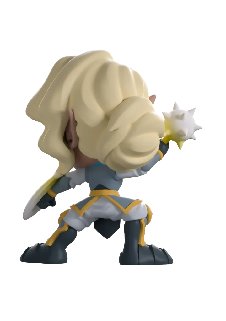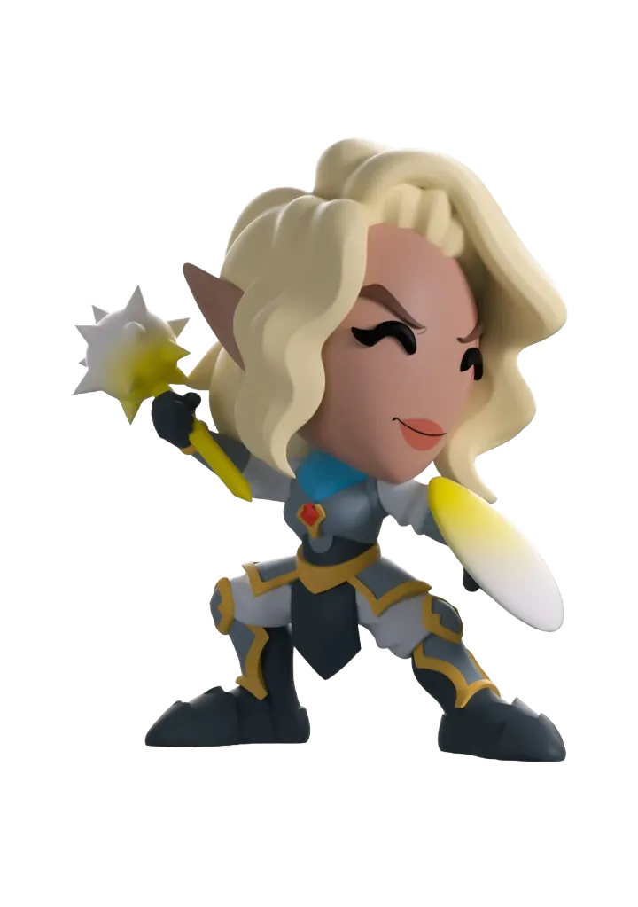 At 4.6 inches tall this Gnome Cleric stands in a wide stance as she holds her hard light shield and mace and is dressed ready for battle in her notable grey-toned plate armor which is decorated with yellow detailing and leads up to a red gem held in place in the middle of her chest. With a light blue scarf wrapped around her neck, her blonde hair is tied up in a low bun as her bangs are pushed over to frame her face and the scar over her left eye. Her windowed display box has been illustrated to show Pike with her hands clasped with a strained face as she prays surrounded by lit candles. While the interior of the box has been illustrated to show dark waves of water with strings of yellow light dancing across the box as the protective sleeve shows the silhouettes of the Vox Machina team in front of sun setting sky.