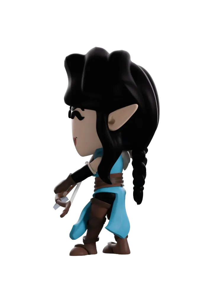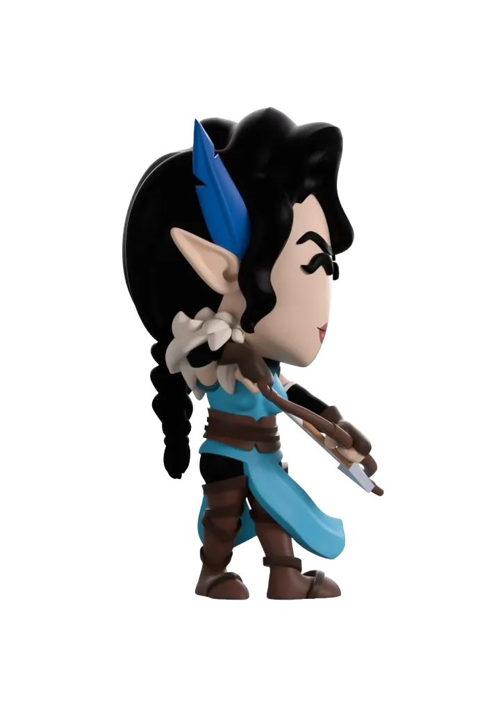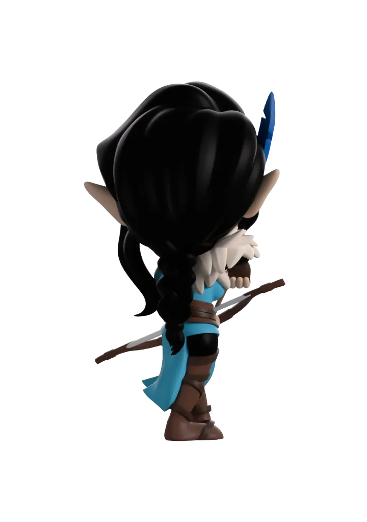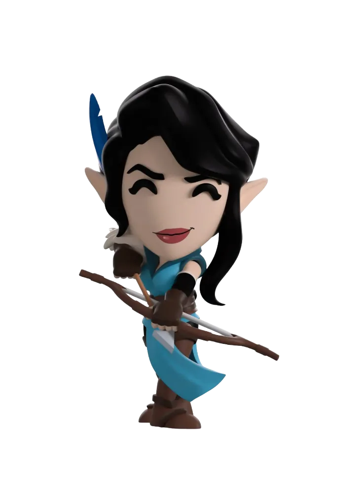 Vex’Ahlia has hit the bullseye and is finally a Youtooz figure! At 5.2 inches tall, this half-elf ranger means business as she stands with her feet beveled and wearing brown thigh-high boots. With wind blowing her blue tunic to the side, wide brown belt around her waist keeps it firmly in place as hey left arm holds a bow to her front as the right is is poised at the ready to release a devastating shot. Accessorised with brown gloves, black armbands and white feathers over her right shoulder, her black hair is tied back in a thin braid with long bangs framing her mischievous smirking face while a blue feather sits above her right ear highlighting her elongated elf ears. The windowed display box shows Vex standing with her bow drawn in the middle of a dark forest and surrounded by foliage and speckled with dots of light. While the interior has been illustrated to show dark waves of water with strings of yellow light dancing across the box as the protective sleeve shows the silhouettes of the Vox Machina team in front of sun setting sky.