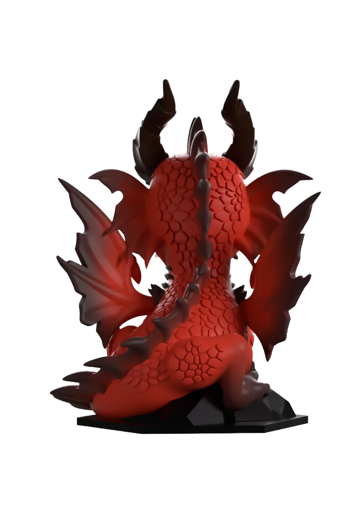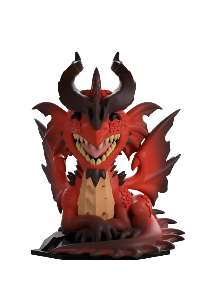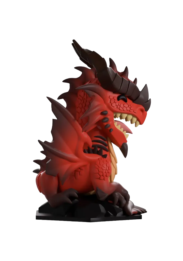 Perched elegantly at over 4 1/2-inches tall with devastating clawed feet crossed in front of them and a toothy open smile reaching up through their red scaled face, two long horns stretch out from their spiked nose to twist and point behind them. With a spun fin running from their head down to the long tail which wraps around their front, their segmented chest is a deep beige as jagged wings reach out from their shoulders. The exterior of their packaging sees them in the dark depths of a cave surrounded by piles of glistening gold. The interior is then covered in vectors of dice over a black background and has the bright red D&D logo on the rear, while the protective sleeve leads you down a hazy path where their figure can be seen through the large clear window at the packaging’s front.
