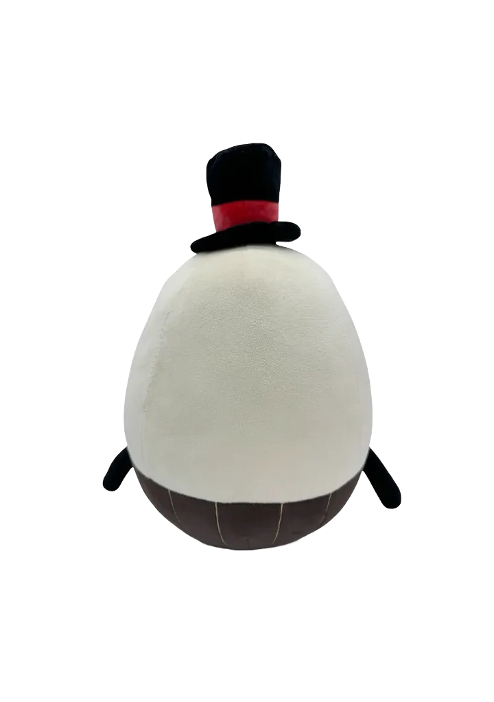 Sitting at 9 inches tall with thin arms and legs sticking out from a round body, his yellow eyes shine out from a jagged hole in his face as a sharp smile cracks across its front. Now he may be a boi but he’s definitely dressed as a man, wearing a small top hat with a pink band around its brim and a pinstripe black suit over a yellow shirt.