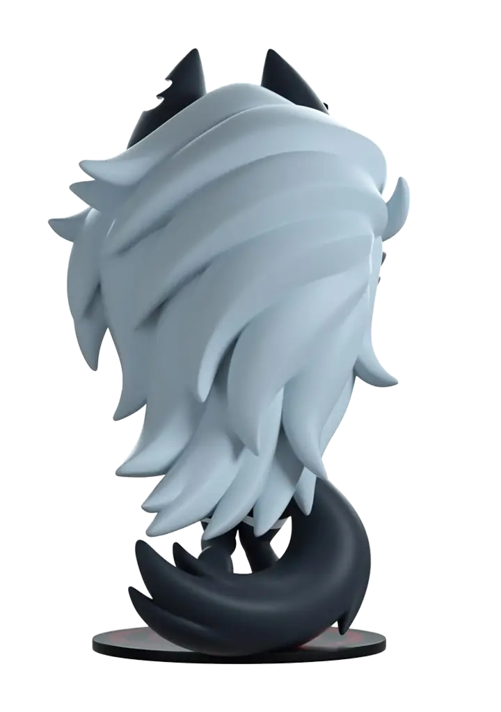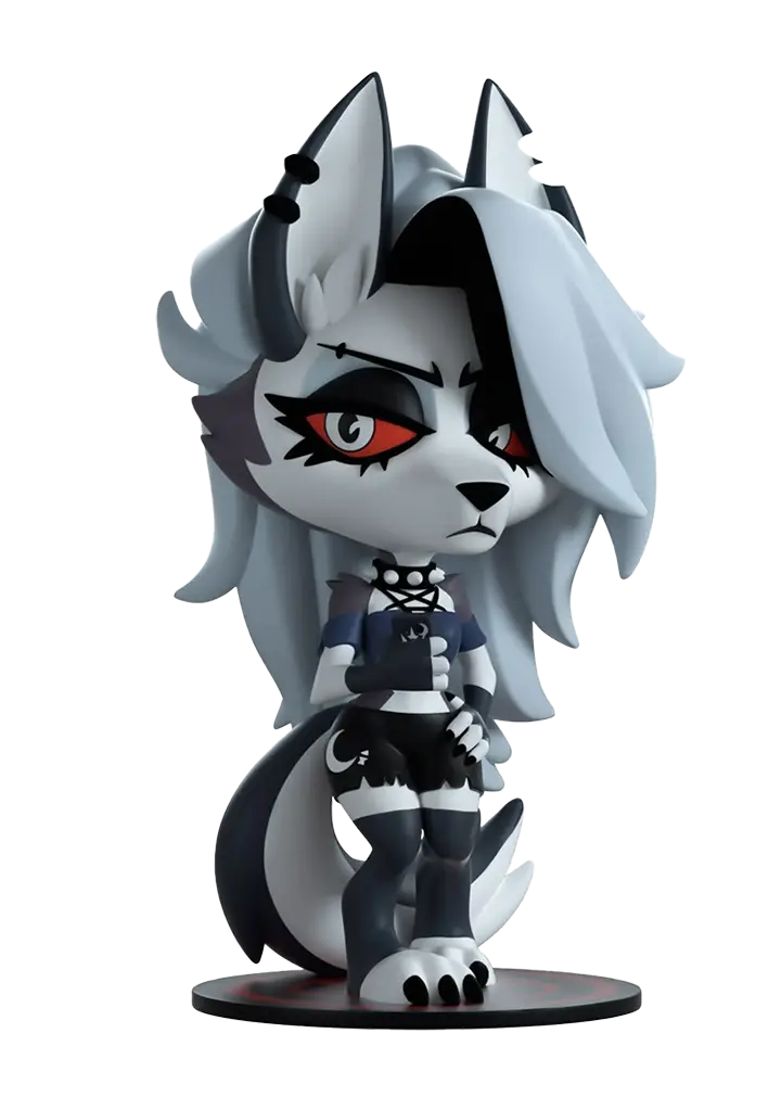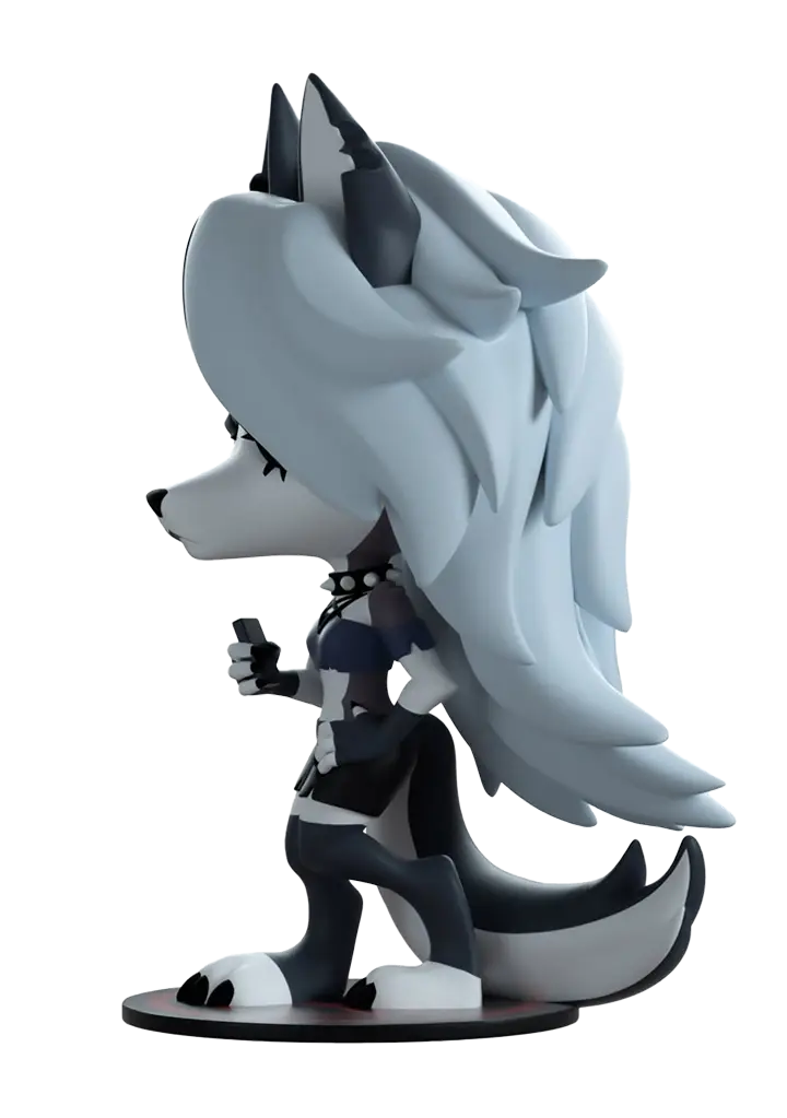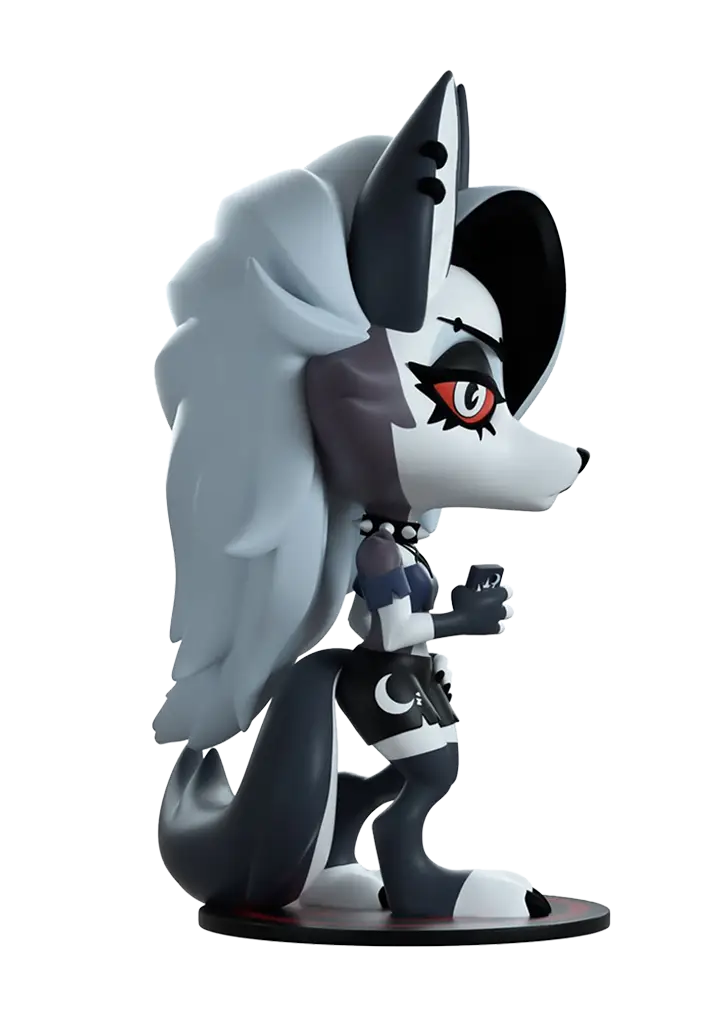 Loona lands at Youtooz to make her Youtooz debut, not that she wants to or anything… Standing at 12.7cm tall with her knees pressed together and a bushy black and white tail flicking out, her long grey fringe sweeps over an unimpressed face as the rest of her hair falls down her back. With deep red eyes glancing to the side and gripping a phone in her right paw as the left rests on her hip, she wears a spiked collar and blue top with pentagram straps at its front along with black and white shorts. The exterior of their packaging sees a cool blue silhouette against a dark background, while the interior surrounds them entirely in maroon stripes that are reminiscent of dirty wallpaper. The protective sleeve is then patterned with diagonal black and white stripes and printed with the ‘Helluva Boss’ logo as their figure can be seen through the large clear display window at its front.