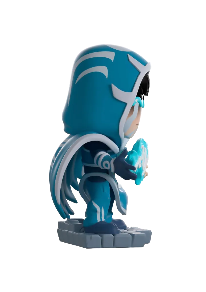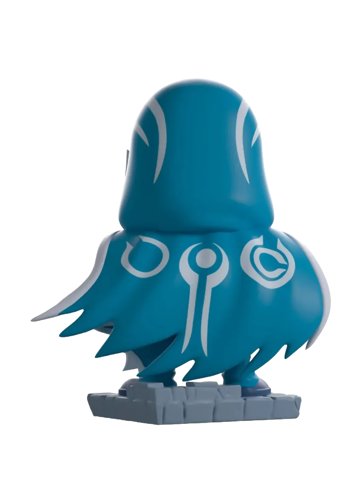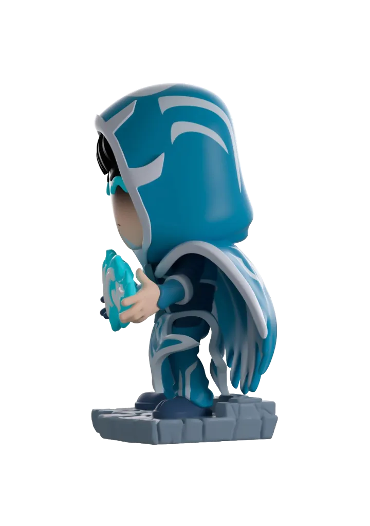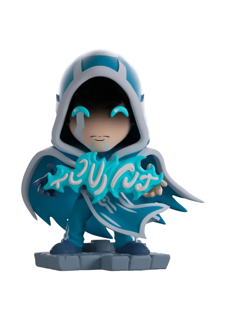 Jace has harnessed the power of his spark and the knowledge of his training to Planeswalk into Youtooz for his debut! Standing atop a rocky outcrop at 4.8 inches tall with bright blue eyes shining out from the darkness the hood pulled over his head casts, his lips are pursed in concentration as his face is marked with light blue streaks. Stretching his hands outwards as he summons forth a bright blue and white streak of magic from his palms, his long blue intricately patterned cloak raises up from his shoulders to sweep to the side with jagged tips. The exterior of his packaging sees bright blue magic swirling across a series of tall ancient buildings, while the interior is pitch black with speckled maroon rising from its bottom. The protective sleeve then looks out into the dark cloudy sky which is filled with floating spires atop jagged rocks as his figure can be seen through the large clear window at the packaging’s front.