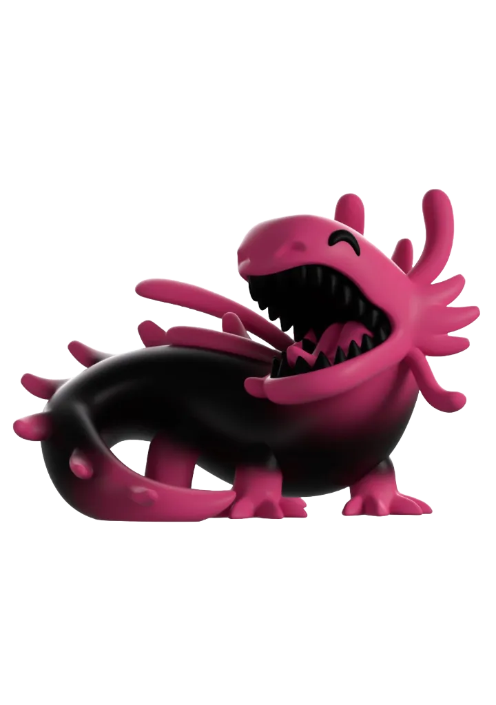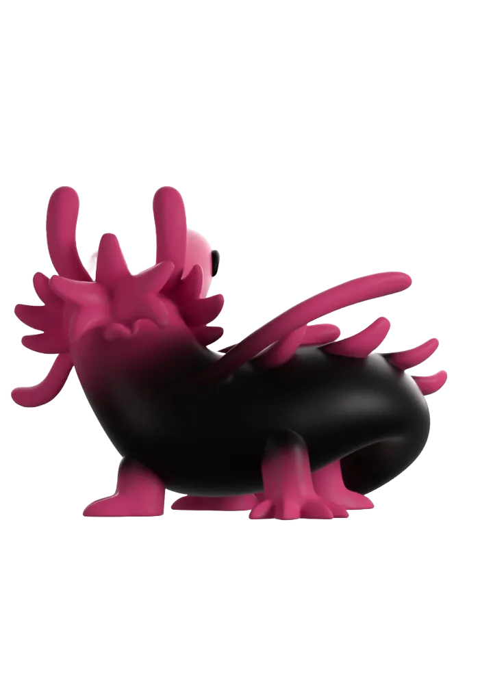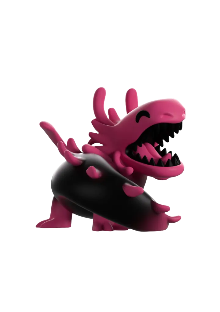 Oh no, we’ve become the new hunting ground of the Pink Lizard with their Youtooz debut! At 3 inches tall with a long pink and black gradient body snaking around as they open their mouth to reveal a series of pitch black teeth, their rounded nose leads down to thick frills at the back of their heads as blunt spines stretch all the way down theory back onto a curled tail. The exterior of their packaging sees them standing atop a metal ledge as thick vines wrap through the dilapidated structures in the distance, these then weave their way into the interior to surround them completely. The protective sleeve casts the ruined world in a green haze as their figure can be seen through the large clear window at the packaging’s front.