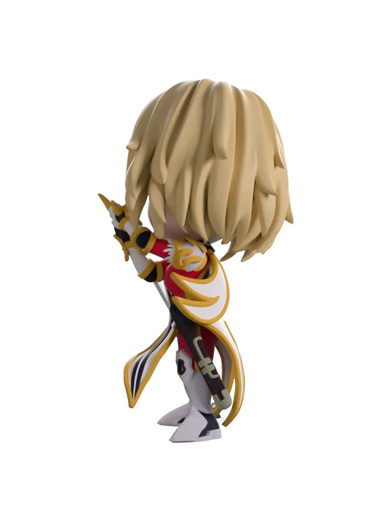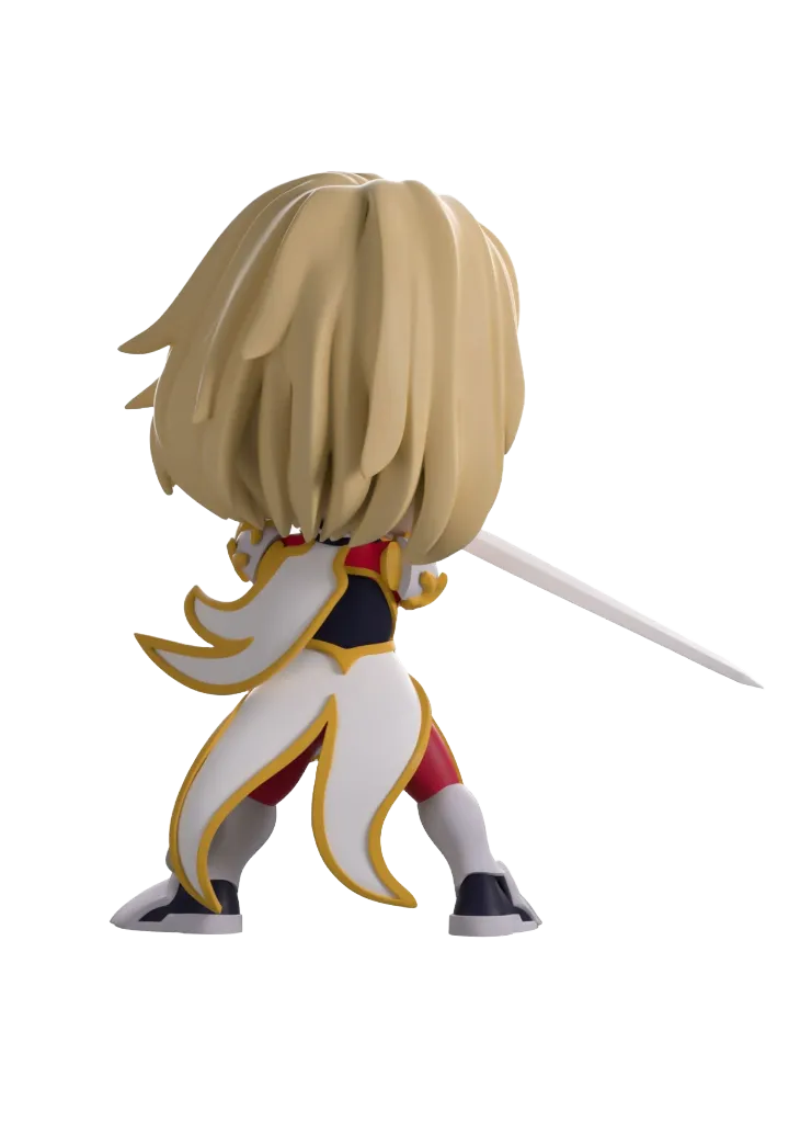 At 4.5 inches tall and posed holding her slender Sword of Light pointed down as she readies to unleash a flurry of quick blows, her pink-orange eyes stare out in determination as golden blonde hair flicks out to the side of her head. Wearing ornate red and white armour that has a deep gold trim and wraps around her twisting body, a long sheath hangs to her side as she wears pointed white greaves that come up to cover her knees. The exterior of his packaging looks onto a street crossing with the lights from building windows shining through the darkness of night. The interior then is covered in a white-to-blue gradient with the ‘Solo Leveling’ logo printed on the back, while the protective sleeve looks up at a dilapidated building as a large blue moon shines above a city skyline as his figure can be seen through the large clear window at the packaging’s front.