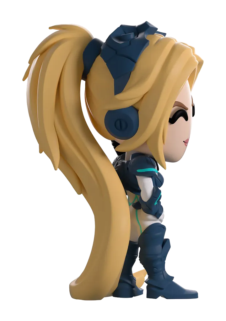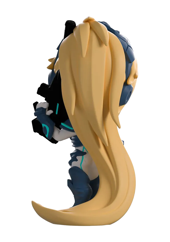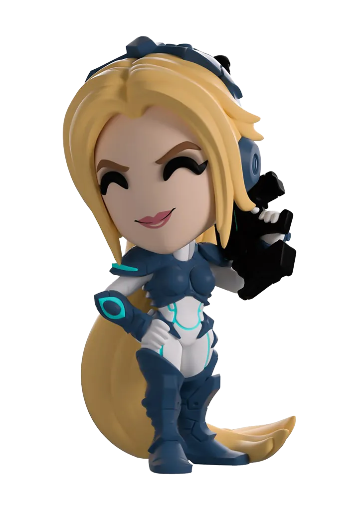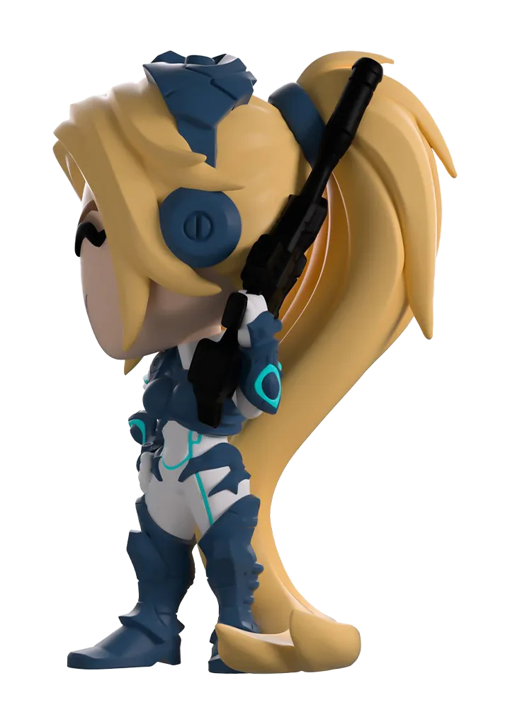 Nova Terra is here to make her Youtooz debut, standing at over 4 1/2-inches tall. Dressed wearing her iconic blue and white body armor, her extra long blonde ponytail brushes the floor. With her left hand cocked on her hip, her right hand holds a black rifle towards the sky. The windowed display box has been illustrated to show Terra standing in a desolate mountainous area as a black space ship descends behind her. The interior of the box is blue, with the Terran logo patterned all across the box. The protective sleeve is a screen of a star-filled night sky.